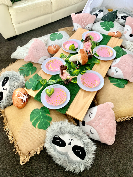 An indoor or outdoor picnic party, complete with a picnic set-up with plates and cups alongside a teepee. Picnic party-only themes include Kowhai and Palm Beach, as well as any existing teepee party theme.